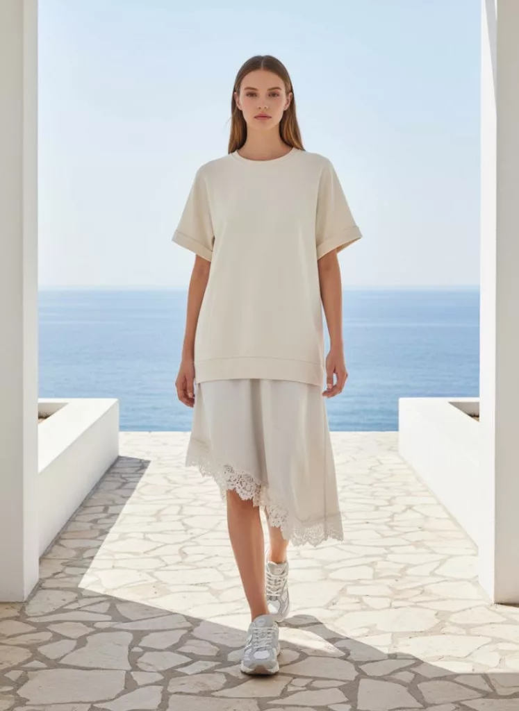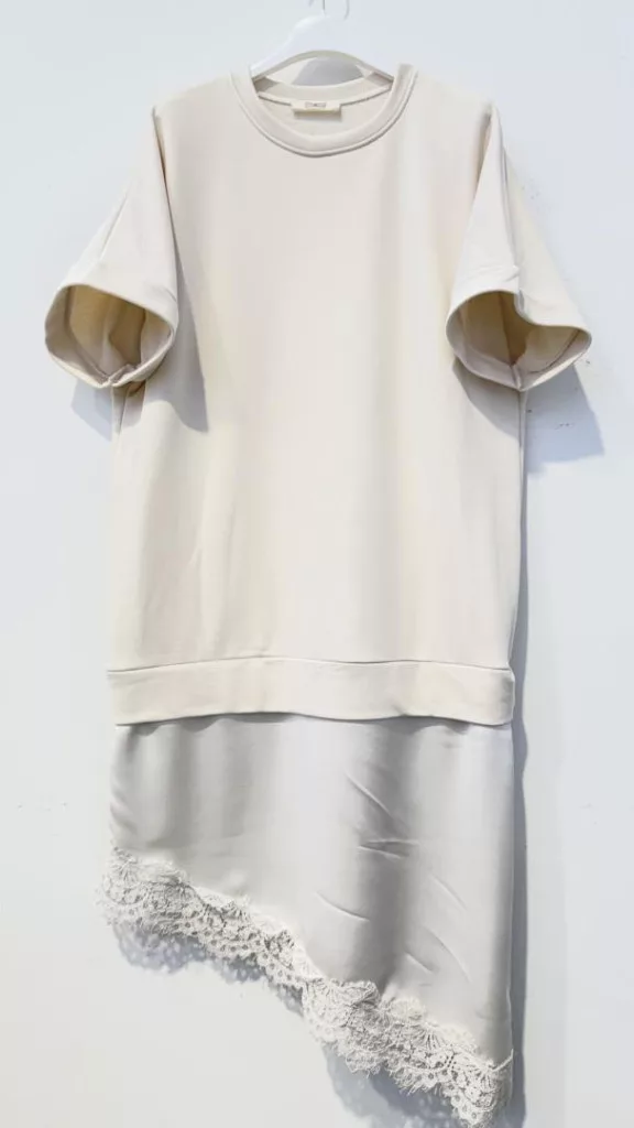 Beunique Fashion finomkötött ruha alján asszimetrikus selyemszatén csipke rátétes szoknya résszel Beige One size