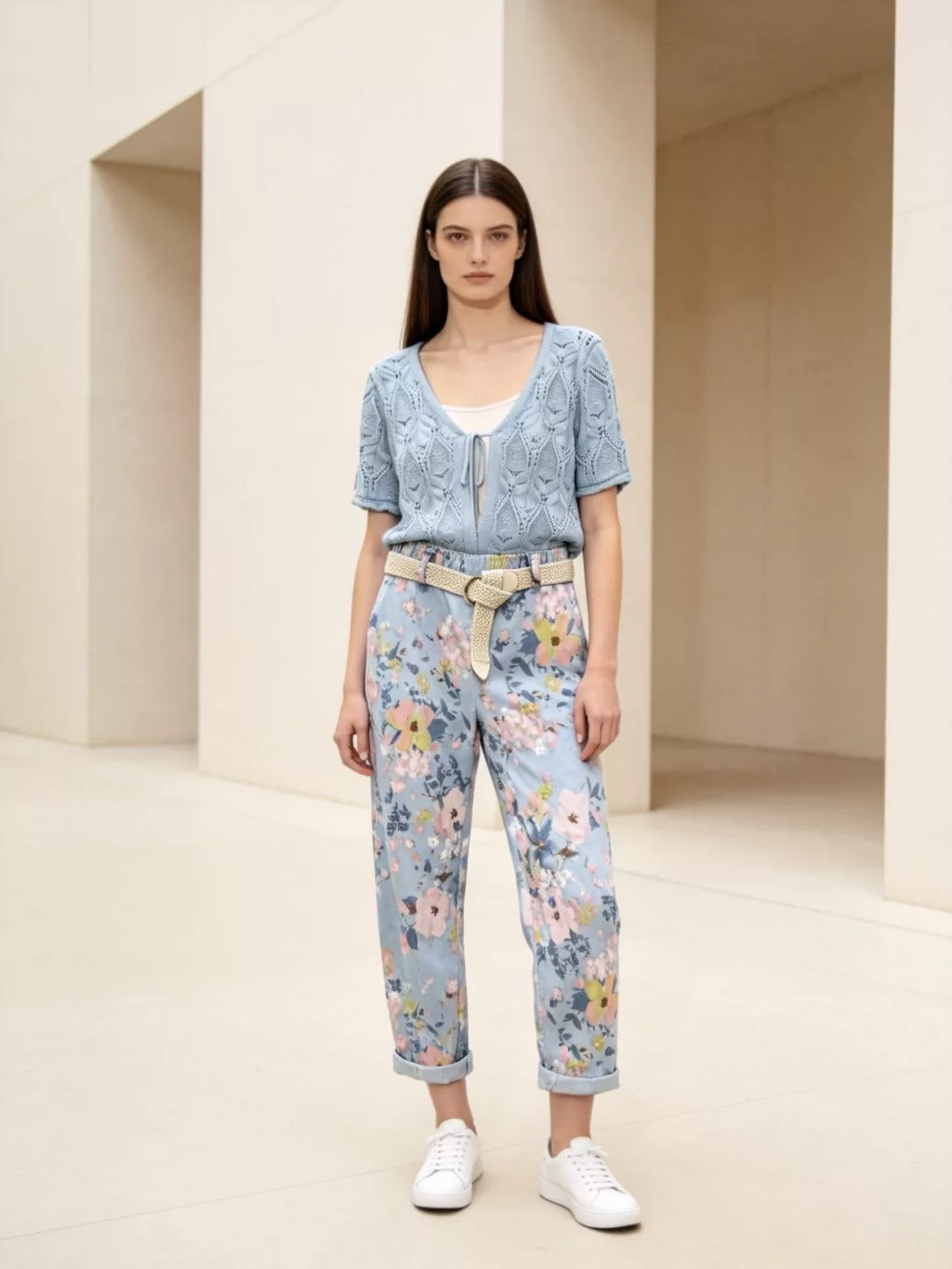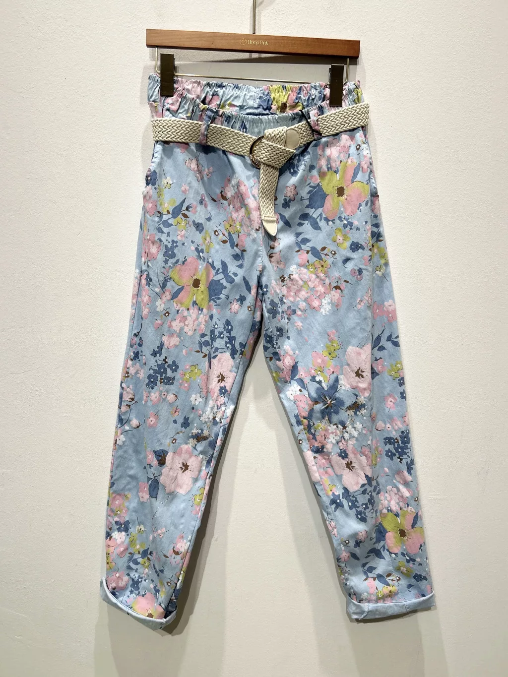 Beunique Fashion rugalmas pamut nadrág virág mintával szűkszárú felhajtós Light Blue One size